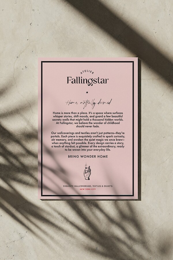 (About) For Fallingstar, Noon crafted a captivating, whimsical brand that transforms everyday interiors into realms of imagination. Inspired by the idea that walls can hold hidden worlds, we developed a visual identity that evokes nostalgia, wonder, and a touch of stardust. Our team conceptualized an enchanting campaign and designed animated social media assets that bring the brand’s storytelling vividly to life. We also created fantastical packaging that feels like unwrapping a secret, perfectly reflecting the belief that home should awaken childlike curiosity. Every element invites audiences to experience Fallingstar’s wallpapers and textiles not just as decor, but as portals to something beautifully extraordinary.